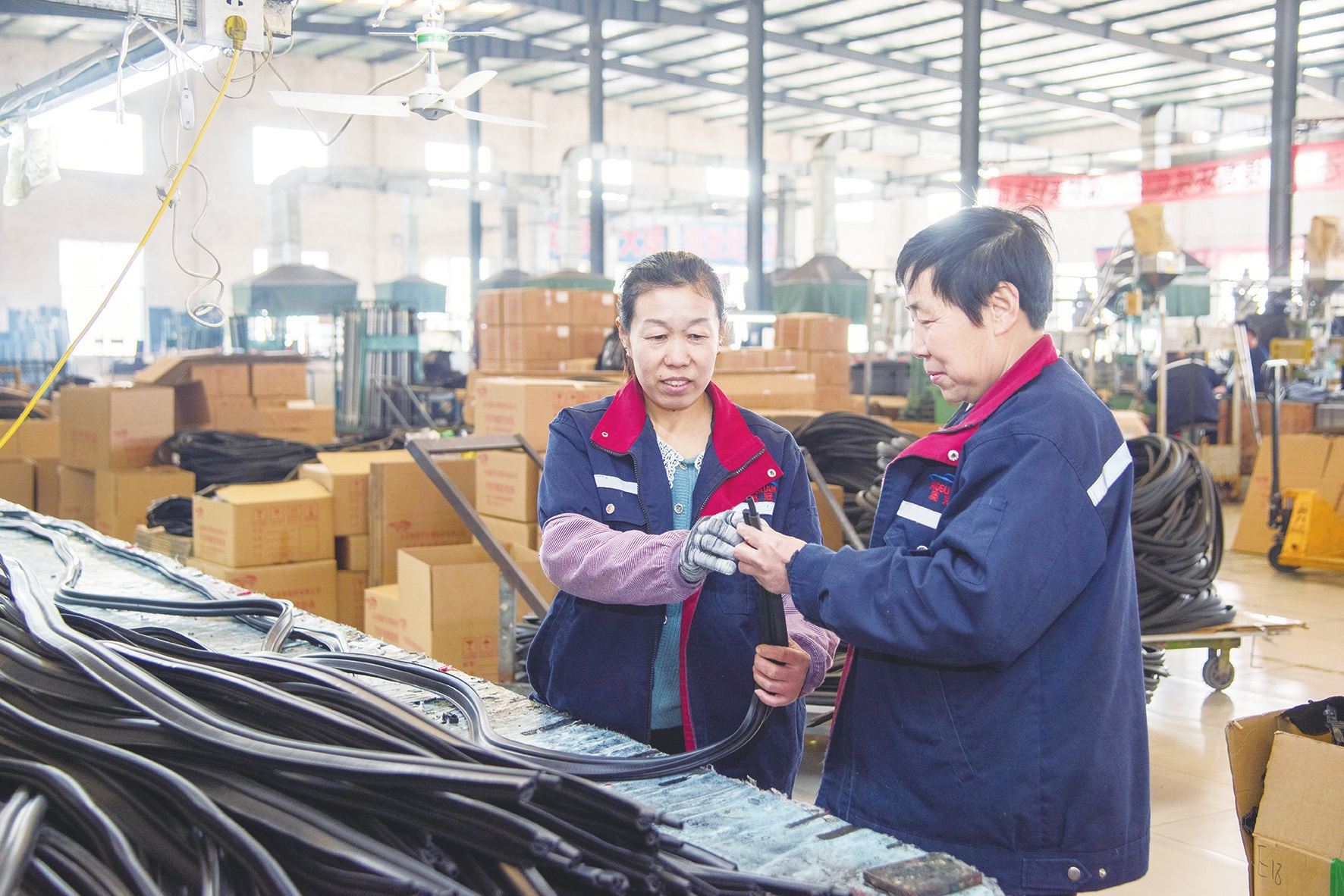 在包装组,46岁的残疾职工胡燕与健全职工张凤芝是黄金搭档。她们干活利索、配合默契,日均打包产品90余箱。“刚刚上岗时我腿脚不方便,操作不熟练,凤芝和我一组干活,没少帮助我。”胡燕感激地说。张凤芝则笑着回应:“大家在一起就是兄弟姐妹,互相帮衬是应该的。”这种互助的氛围,让胡燕一干就是9年,“这里让我安心,我愿意一直干下去。”